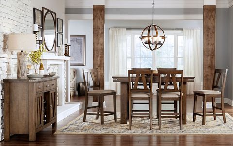 Featuring wrapped metal band details Eastwood’s clean lines and versatility brings function and style to any space. The smooth, rich tobacco finish makes a great complement to any room while the thickly padded and upholstered seats offer outstanding comfort. Thanks to the butterfly leaf extensions on the trestle and gathering height tables, this collection allows you to effortlessly increase the table length to accommodate more guests. Function and versatility are what this collection is all about.