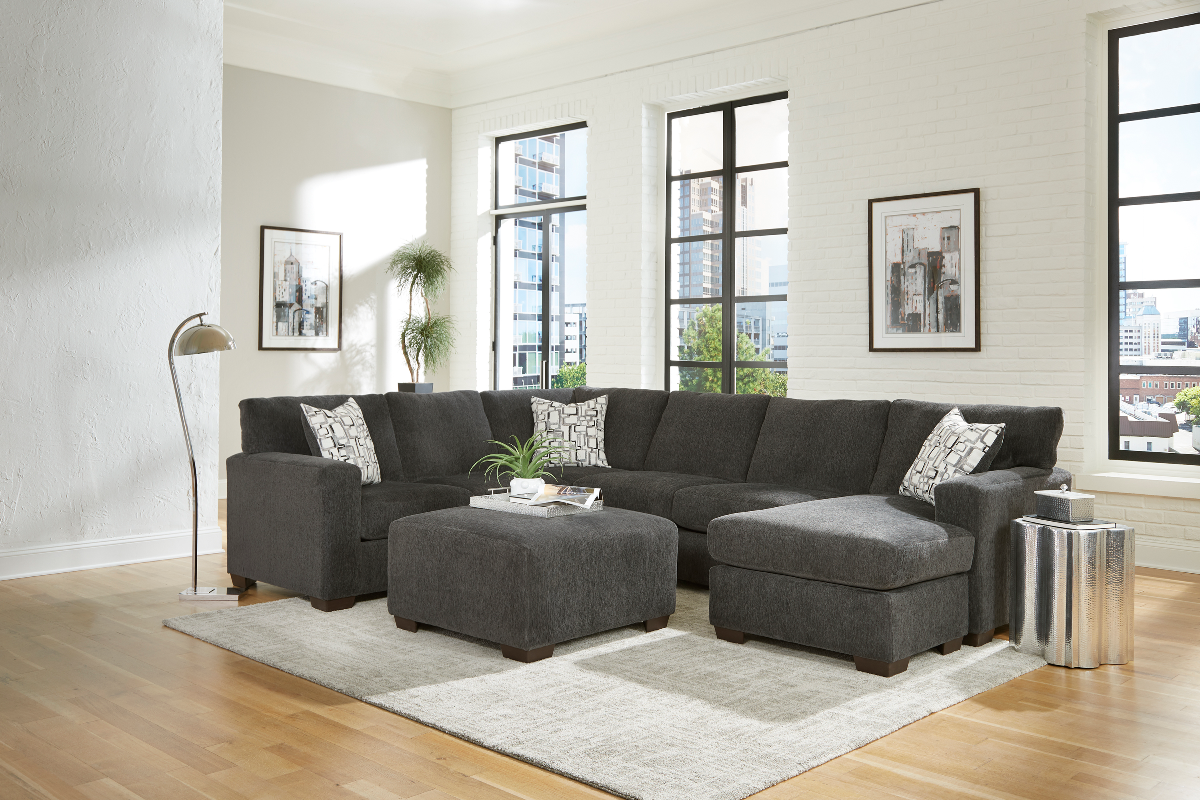 Set includes 2 piece casual sectional with chaise end and accent pillow in a charcoal gray fabric.Read More