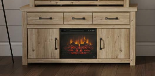 Natural rustic finish over replicated oak grain with authentic touch. Case features framed top and large scale dark bronze colored hooded pulls and knobs. Side roller glides for smooth operating drawers. Two spacious hidden storage compartments behind doors. Compatible with W100-101 fireplace inserts.Read More