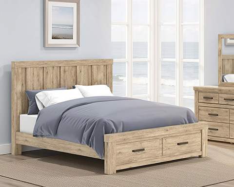 Natural rustic finish over replicated oak grain with authentic touch. Headboard features vertical paneling and imitated log details.Read More