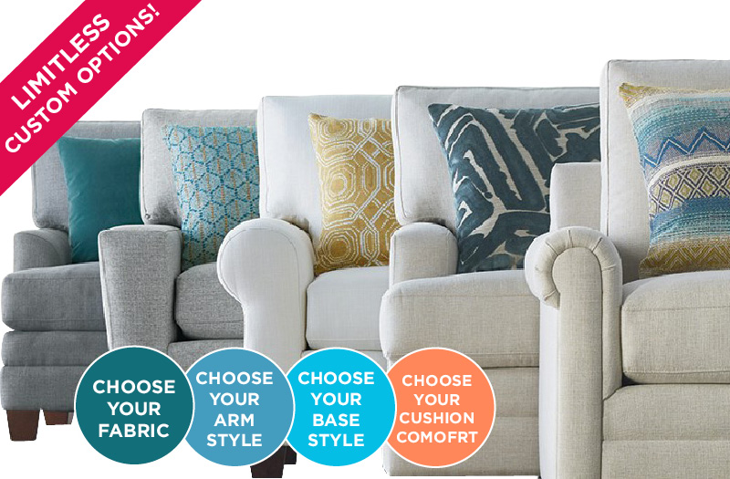 Visit us in-store to design your custom furniture by Bassett® today! Nearly limitless selection of custom upholstery options!