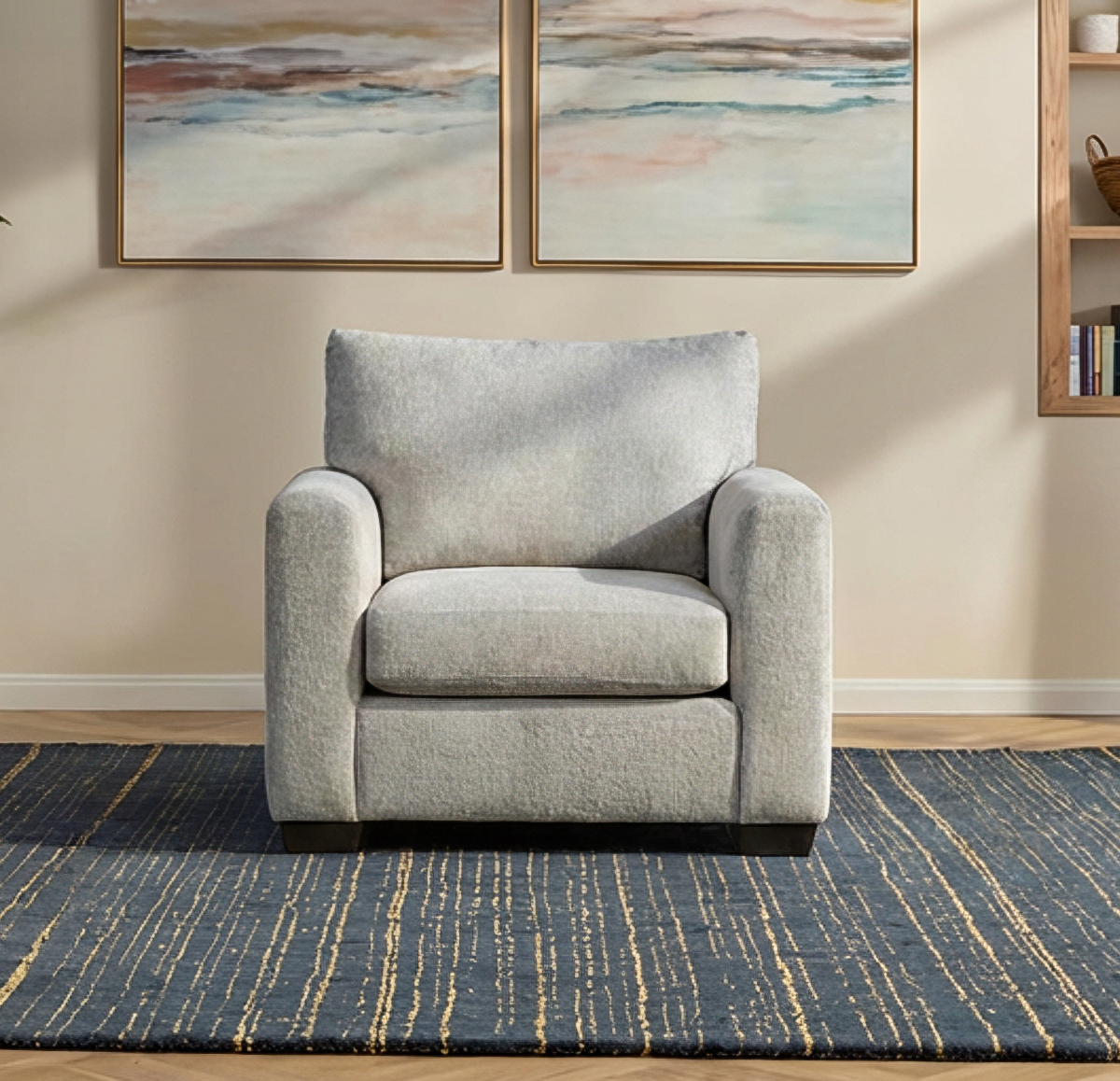 The Franz collection transitional chair in a parchment color fabric with accent pillows.Read More