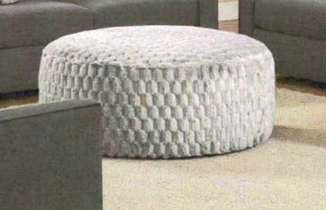 Plush round ottoman in a light gray fabric.