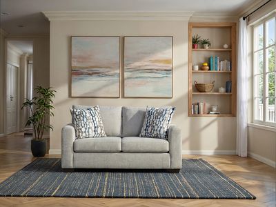 The Franz collection transitional loveseat in a parchment color fabric with accent pillows.Read More