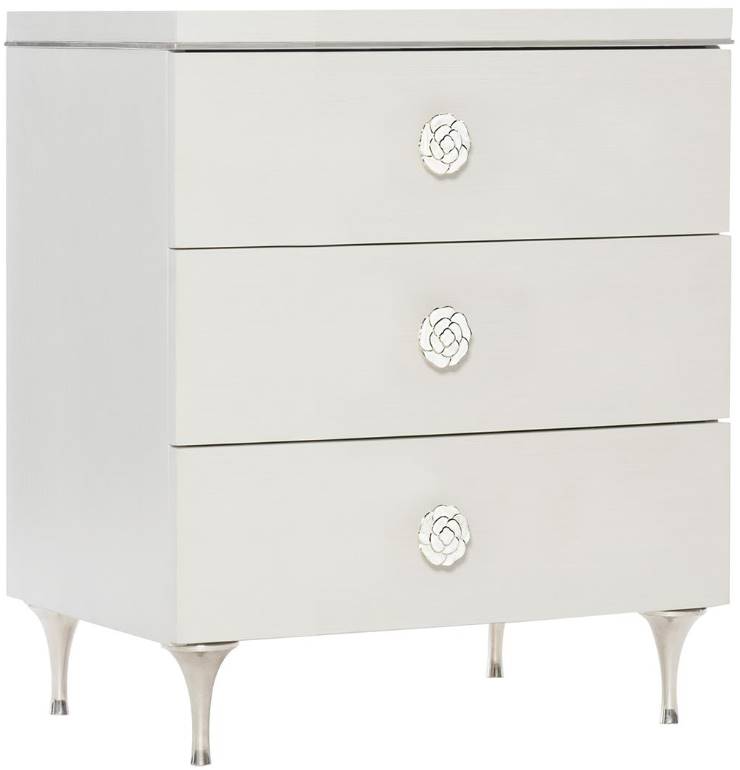 Silhouette is defined by bold contrasts, clean lines and a hint of Hollywood Regency glamour. The Silhouette nightstand is in a class of its own. Glamorous, sleek and modern, it features an Eggshell wood finish accented by polished stainless steel beading and hardware.Read More