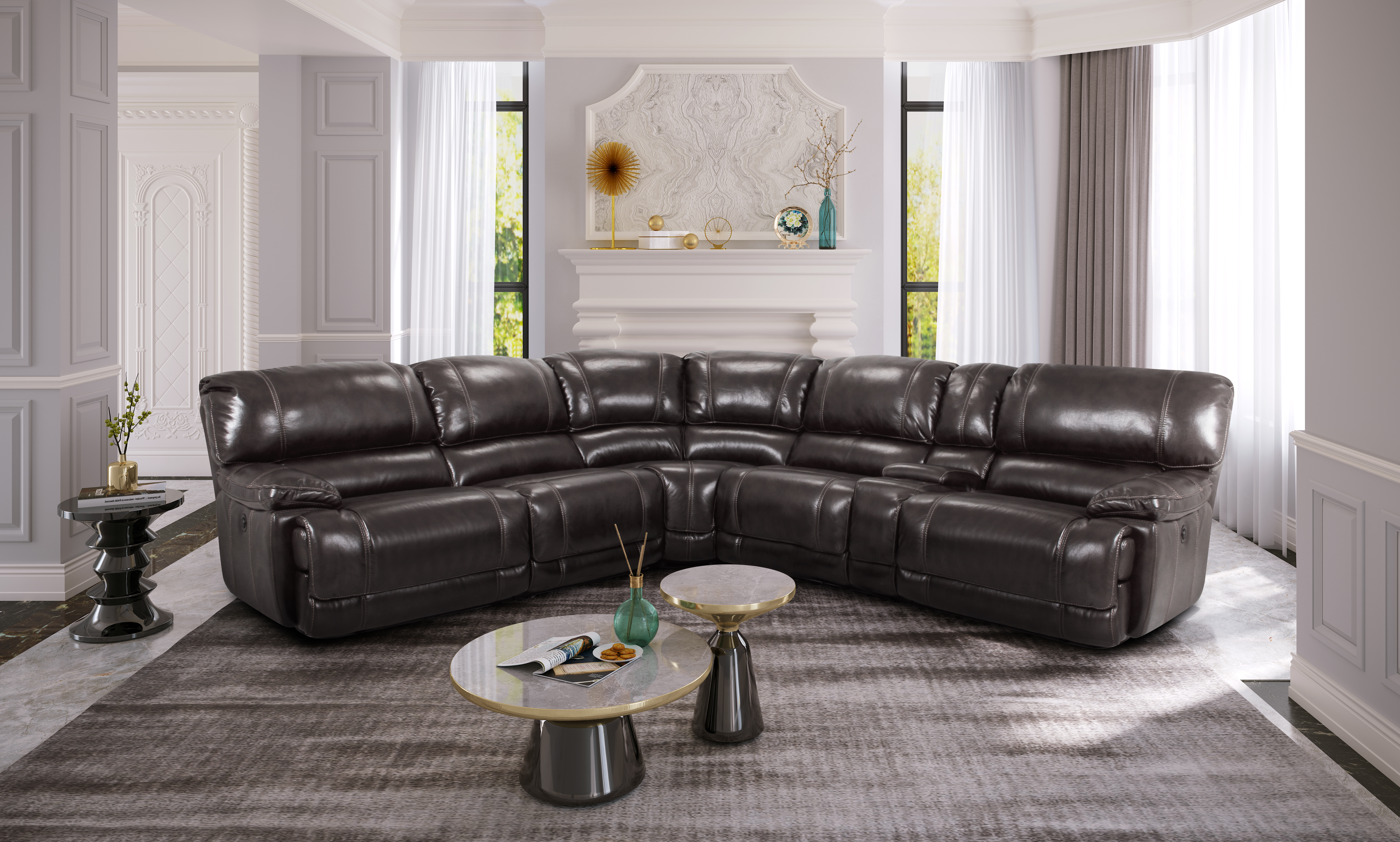 Complete Sectional Includes: (1) Consoles, (1) Left Arm Facing Power Headrest Recliner, (1) Right Arm Facing Power Headrest Recliner, (1) Armless Chair, (1) Armless Power Headrest Recliner, and (1) Corner Wedge)