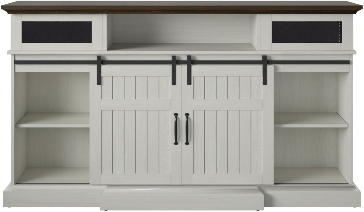 The Manning TV stand in Antique White will add a warm, country flair to your living space, while accommodating most flat screen TVs up to 80" and up to 155 lbs. Experience rich sound from the integrated sound system with (2) 4” main speakers, (2) 1” tweeters and forward facing passive bass ports. The sliding barn doors open to reveal a 28” ClassicFlame infrared quartz electric fireplace (sold separately).Read More