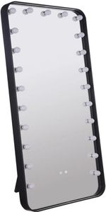 A deep black frame adds definition to a modern lighted standing mirror