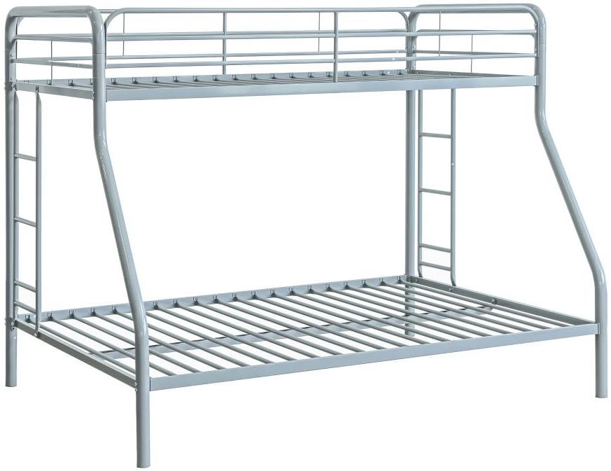 Twin-over-full bunk bed in glossy silver powder-coated finish with durable metal frame