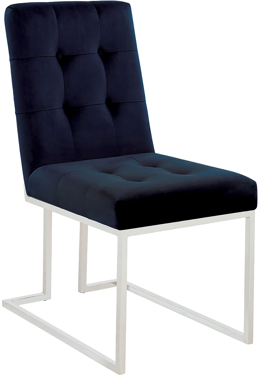 Create a stunning visual with the bold colors from this armless dining chair. Open up a dining room with sleek and metallic chrome legs. The blue cushioned back and seat is filled with button tufting for an elegant look. Bold colors and angles meet to create a luxurious piece that adds style and comfort. Luxury and practicality marry for a sensational piece of decor.