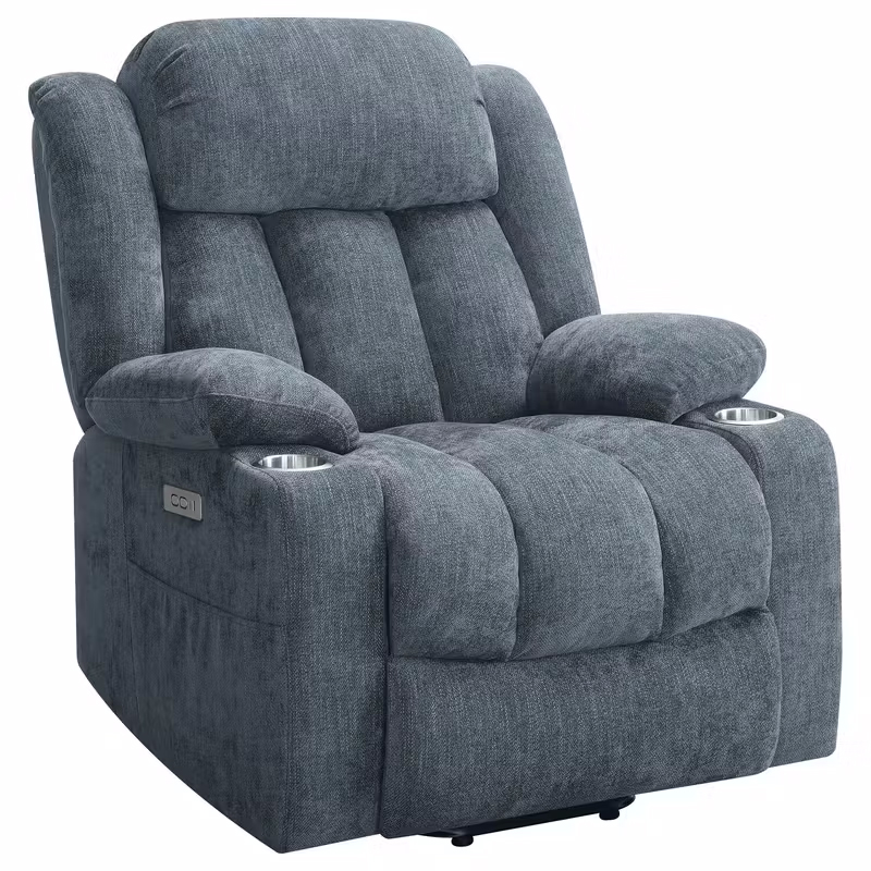 Its plush, overstuffed look is inviting in a living room or den, while contour tufting creates exceptional support for your whole body. The recliner is operated with a power panel that includes simple buttons and a built-in USB port for easy access. The power panel is on the right side when seating and is paired with a soft pocket, perfect for tucking reading materials or a puzzle book. Soft upholstery, pillowtop arms and two cupholders add to the inviting look and feel of this charming recliner.