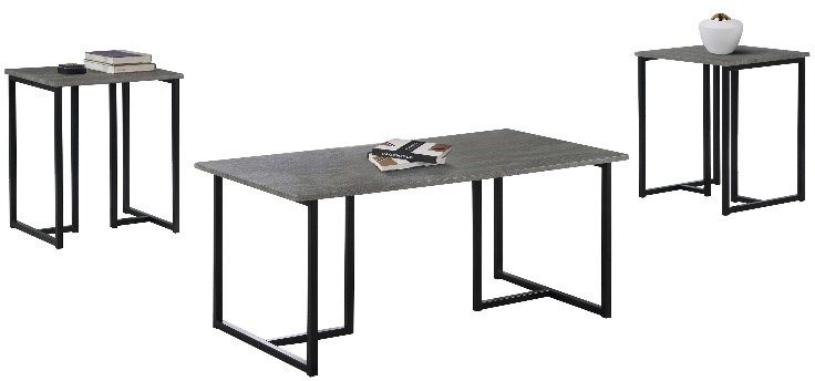This three-piece table set was designed for both contemporary and transitional style living rooms. Complete with a coffee table and two end tables, each matching furniture piece offers a sleek, clean line silhouette. Elevated by a sleek metal base with a black powder coated finish, which also offers an open and airy look. Supported by the base is a smooth, weathered grey tabletop that lends a rustic-inspired, modern farmhouse look. Perfect for more compact rooms, add this set to a college dorm room or a studio apartment to lend a more minimal style.
