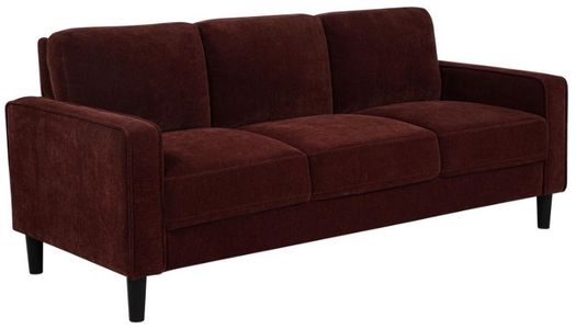 Sofa in rust fabric features a clean-lined silhouette with modern visual softness