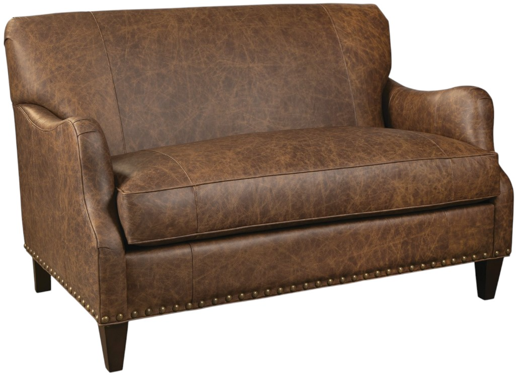 Embrace timeless charm with this beautiful leather English Arm Settee. A plush bench seat, graceful English arms, and refined nail head trim create a classic silhouette. Tapered legs and Blend Down Coil seating complete the look with effortless elegance. Tight Back. Also available without nail head trim.Read More