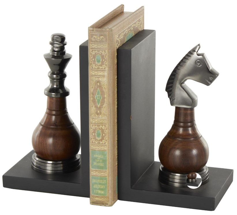 Elevate your living room interior with the chess set of 2 non-skid bookends on a console table or bookshelf to support your books while adding a sophisticated touch. This item ships in 1 carton. Aluminum bookends make a great gift for any occasion. Suitable for indoor use only. This item ships fully assembled in one piece.