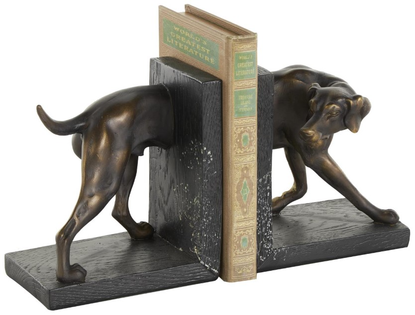 Place each piece of the dog set of 2 non-skid bookends on your bookshelf or console tables in your office, stylishly supporting and organizing your books. Designed with felt or rubber stoppers at the base that prevent scratching furniture and table tops, as well as sliding around. This item ships in 1 carton. Polystone bookends make a great gift for any occasion. Suitable for indoor use only. This item ships fully assembled in one piece.