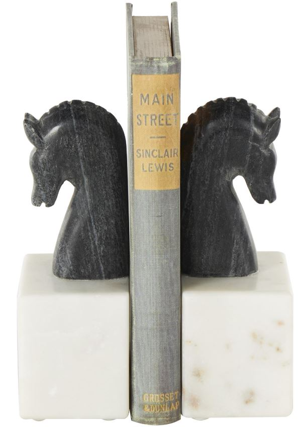 The square book stopper set boasts matte black horse head figures atop white block bases with hints of gold that add to its elegant appeal. The marble set of 2 bookends features a unique horse head design that adds an artistic touch to any shelf or desk.