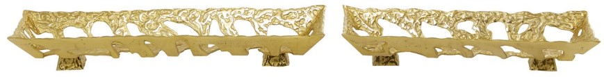 The rectangle decorative tray set showcases a satin gold finish, adding a touch of elegance to any space. This aluminum set of 2 trays features a textured body with abstract cutouts and elevated legs, adding a touch of modernity and functionality.
