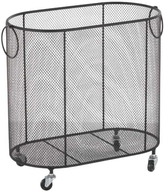 Its oval shape, mesh pattern, and ring handles give this matte black rolling storage cart a contemporary look while maximizing storage space