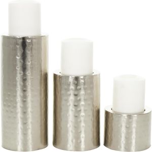 Give your space a radiant illumination with these beautifully crafted candle holders. Made with a sturdy base, it is perfect for creating an elegant atmosphere at your table top or mantel. Place this silver set of 3 candle stands on your mantel or dining table to elevate your space with its industrial-inspired design. Designed with felt or rubber stoppers at the base that prevent scratching furniture and table tops, as well as sliding around. Can hold 3 pillar candles, not included. This item ships in 1 carton. Metal candle holder makes a great gift for any occasion. Due to the handmade nature of this item, no two will be alike, there will be slight differences in shape, size, and color. Suitable for indoor use only. This item ships fully assembled in one piece. Made in India.