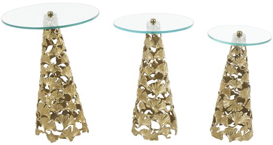 The round tabletop coupled with a cone-shaped base and leaf cutouts gives these satin gold living room tables a modern geometric appeal that would complement any home decor style