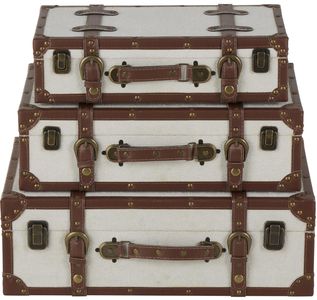 Rectangle trunk set boasts a light gray color with a textured finish, bronze latches and brown leather This wood set of 3 trunks features a spacious interior for storage and an intricately carved exterior that adds to its traditional appeal