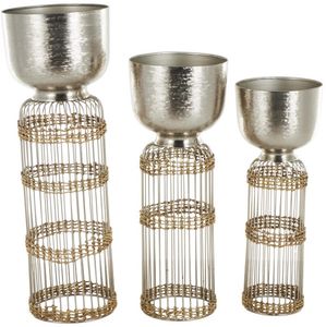 Cylinder plant pot set boasts a satin silver finish with brown wrapped woven seagrass that exudes a sleek and modern appeal. This metal set of 3 planters features a caged wire design, accented with woven seagrass for an added touch of rustic charm.