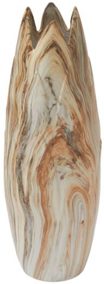 The round home decor vase features a matte beige finish with copper and brown colors on the faux marble ceramic. The stoneware vase boasts an angled edge opening and a marbled design.
