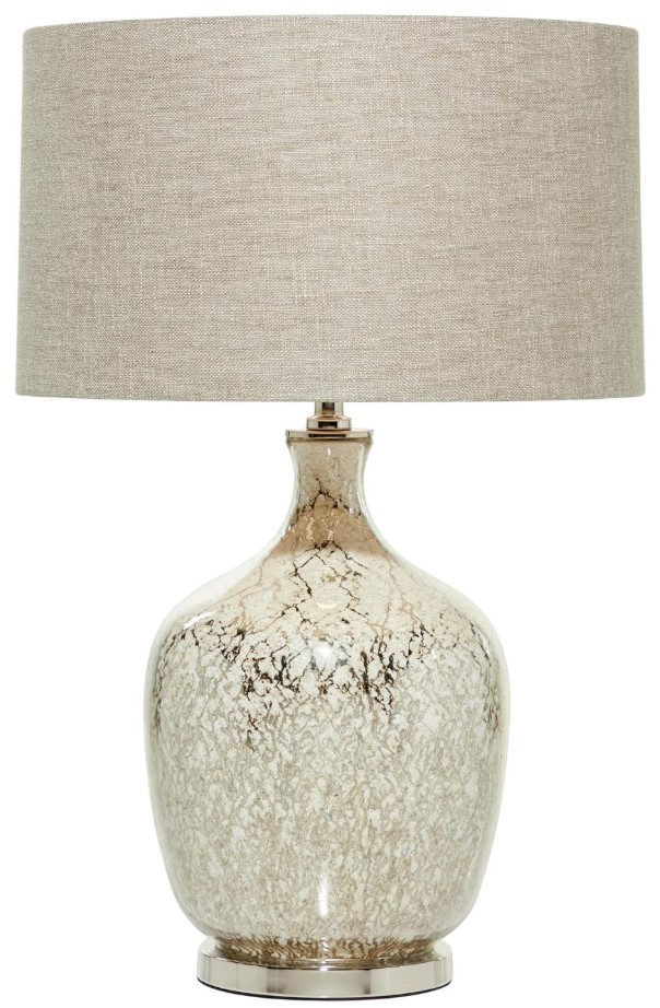 The round table lamp for living room showcases a glossy, transparent mercury glass body with silver marbling and beige shade resting on a silver base. As a feature-rich glass table lamp, it boasts a vase-shaped glass base and a drum shade in matching grayish beige tone.