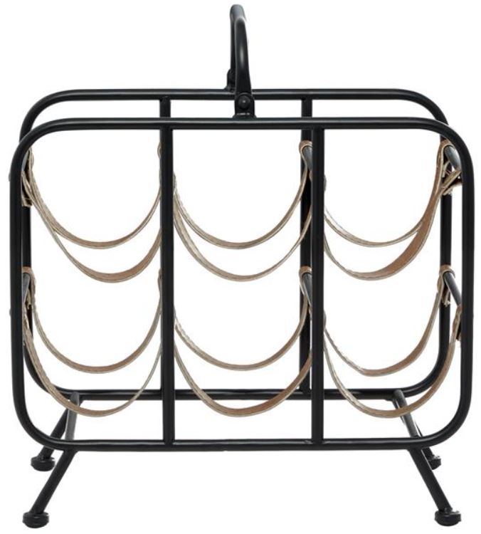 It features a black metal frame finish and a natural brown faux leather strap finish. Item is furnished with 2 tier racks, each rack comes with 3 sets of wine holders.