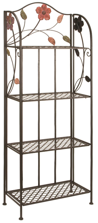 This is a single black colored display shelf. Iron bakers rack features 4 shelves