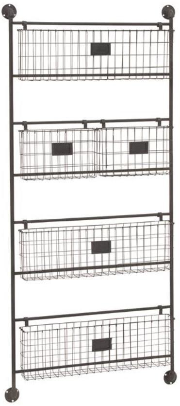 Matte black magazine shelf holder showcases a rectangular frame with rounded corners, holding multiple wire baskets in a vertical grid pattern