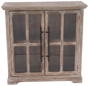 Infuse your home with cozy charm, where weathered textures, rustic finishes, and warm earthy tones create a wholesome atmosphere. Crafted from sustainable wood and glass, this brown room cabinet exudes sophistication and longevity. Rectangle cabinet for storage showcases a classic brown distressed finish, beautifully complemented by the glass panel doors. This wood cabinet features a rectangular body frame with an overhang top and two hinged doors adorned with chic glass panels.