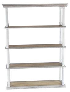 Rectangular shelf organizer features a striking combination of a matte white finish and distressed brown wood, adding visual interest and charm, The MDF shelving unit showcases a towering 5-tier design with spacious racks and turned wood-inspired posts.