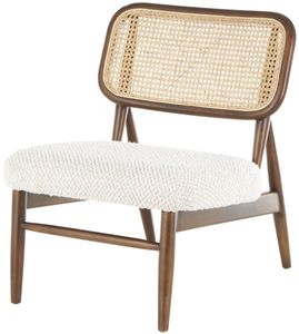 The traditional small space accent chair has a carved rubber wood frame with attached rattan and upholstered fabric, providing comfortable seating