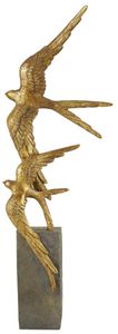 Bird decorative statue features a satin gold finish with a black base, creating a modern and sophisticated look. This polystone sculpture showcases a meticulously detailed bird in mid-flight, perched gracefully atop a pristine black block base, bringing a modern touch to your space.