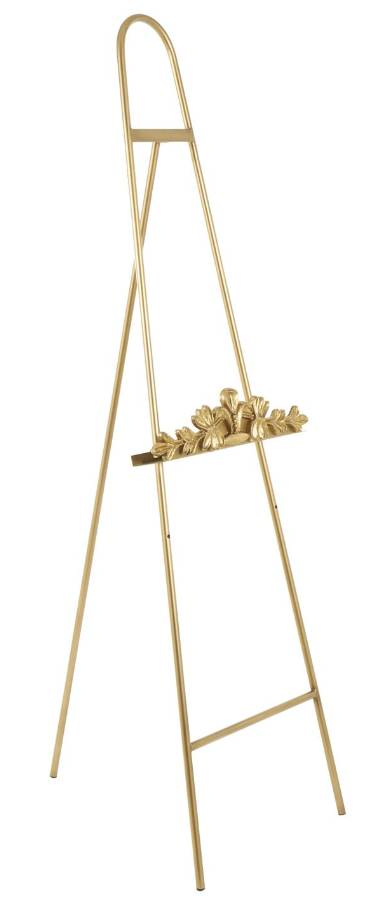 The satin gold decorative easel features an arched triangular shape with a vine emblem, creating a visually compelling and elegant addition to your space