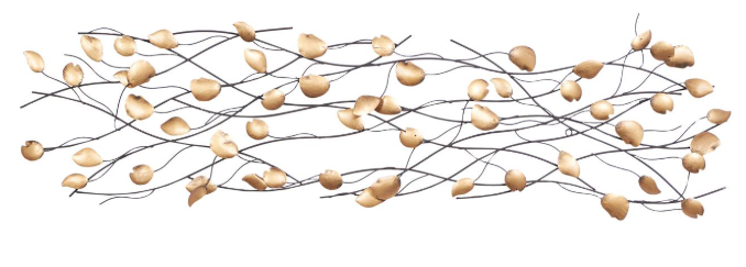 Satin gold wall art for living room stands out with its leaf-shaped embellishments complemented by elongated iron wire details, forming a unique rectangular shape