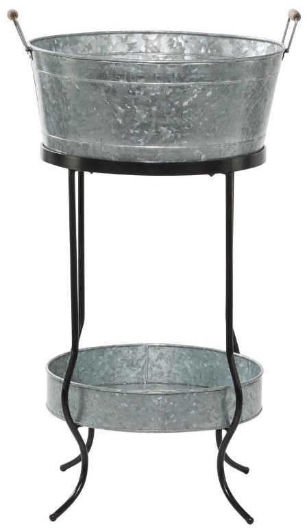 Embrace artistic expression with a style that highlights bold designs with sleek lines, neutral elements, and a minimalist aesthetic. Modern bucket cooler is crafted with solid metal material. Bucket cooler with tray highlights a gray galvanized finish and glossy black frame finish. Gray galvanized bucket cooler features a bottom tray held by curved leg stands.Read More