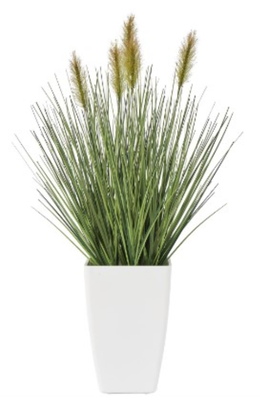 Indoor fake potted plant comes in a traditional onion grass shape with a white tapered pot