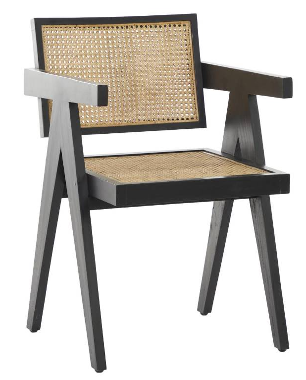 The modern small space accent chair features a woven seat and backrest attached to the carved wooden frame