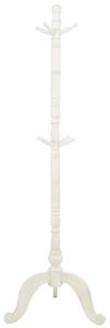Tall white coat rack has 8 hooks on 2 different levels, traditional turned style detailing, and scrolled feet with small leaf carvings that add to the character and charm of the overall design