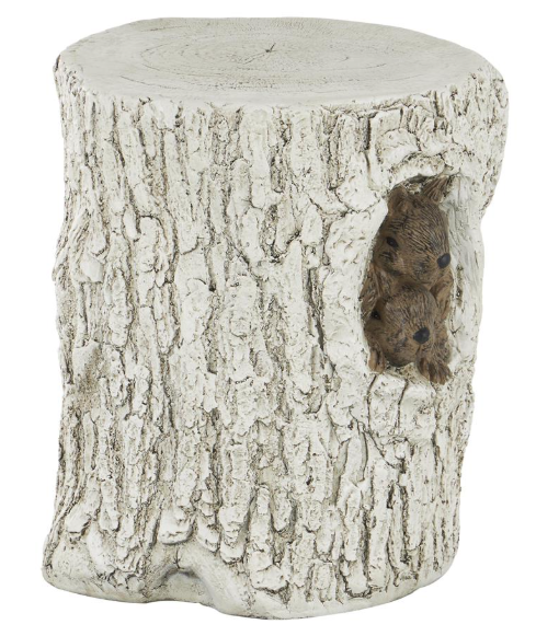 Its cylindrical shape with squirrels in the middle that adds a unique touch to the textured white garden stool, making it a standout addition to any outdoor setting