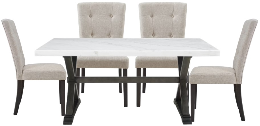 The X style base of the table takes the design to the next level. The chairs are upholstered in a neutral, linen fabric and feature button tufting on the back cushion. Add this set to your home today for a look that will never go out of style!