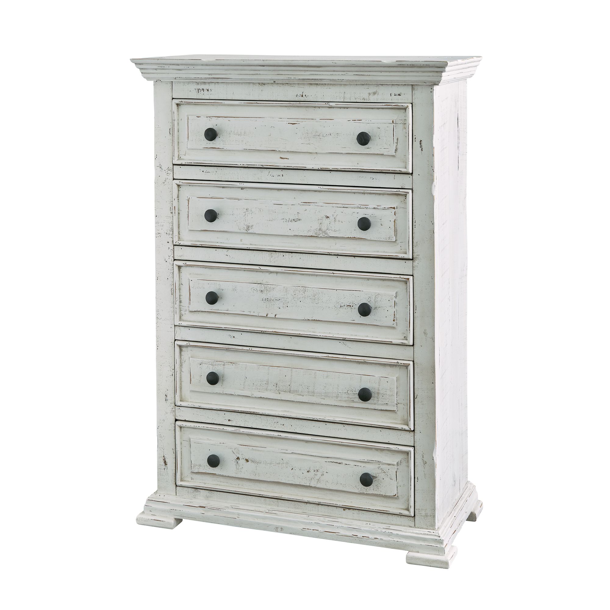 The Bedroom Chest from Element's International Collection features beautiful moldings in a trendy distressed white finish.