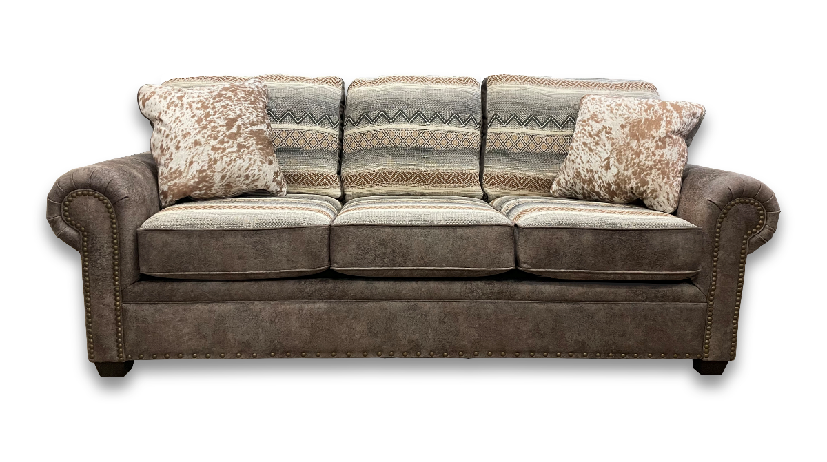 The lodge look is alive and well in our Jaden sofa. A three cushion style in married fabrics with pyramid legs and rolled and welted arms. Toss pillows are reversible. Novelty patterns combined with a leather-look-alike provide the perfect choice for your cabin or retreat home. Loveseat, chair and ottoman also available.Read More