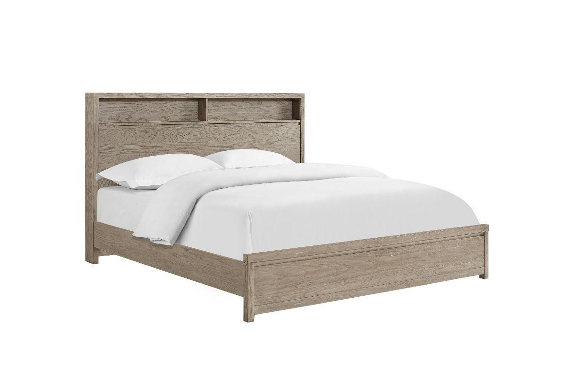 Casual contemporary furnishings have never been more represented than with Oakhurst. Made with White oak veneers and wire-brushed poplar solids, Sherwin Williams created an “Aged Natural-Oak” finish that enhances the grain of the oak and is simple to decorate in any region. Shadow lines to define the wide planking. The headboard features an open-shelf storage on the top, perfect to hold books, when you are ready for a nights rest. An LED back lighting to turn on and create a halo around the headboard.Read More