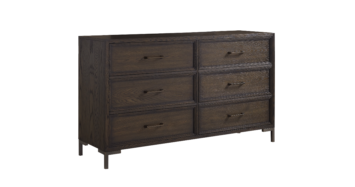 Casual contemporary design with a smaller scale. The dresser is made from white oak veneers and oak solids. Sherwin Williams developed a “Branch” tone that looks like the natural color of a dried tree limb. The metal legs and drawer handles are powder coated in a matt black with edges polished to show a hint of copper.Read More