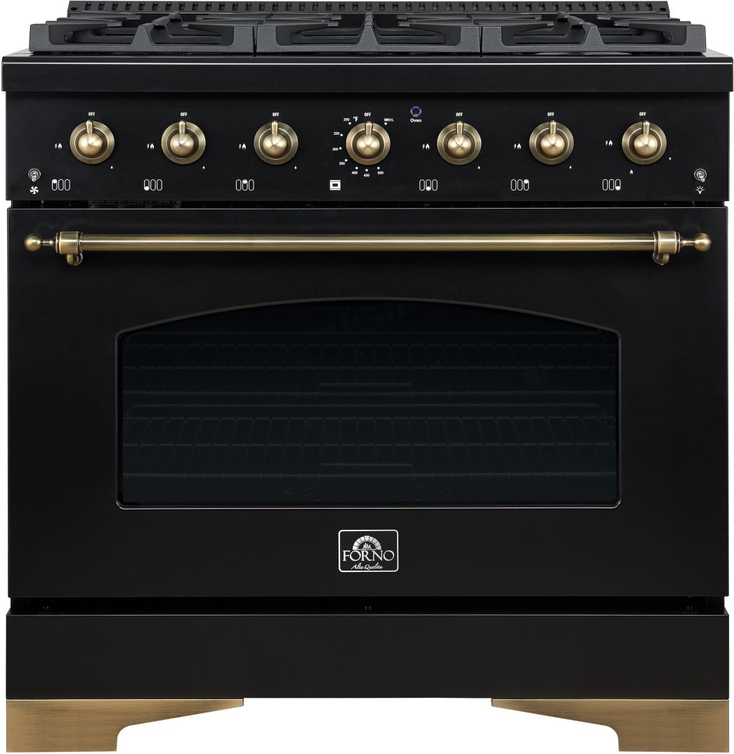 The spacious 4.5 cu.ft convection oven ensures even baking and roasting, while the recessed enamel cooktop makes cleanup effortless. Finished in sleek black with antique brass accents, this range brings timeless elegance to your kitchen. Durable cast-iron grates provide stability and smooth cookware movement. Backed by a 2-year warranty, the Antico range combines professional-grade quality with vintage charm, making it the centerpiece of your culinary space.