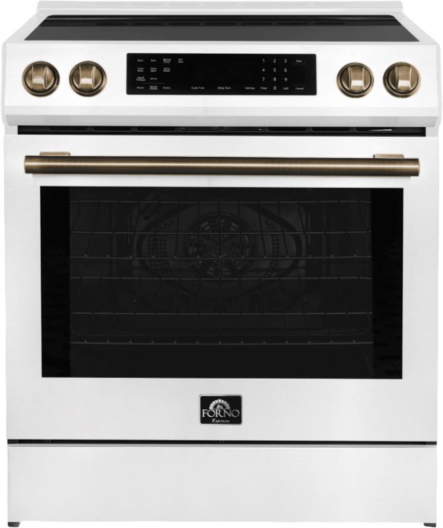 The FORNO Donatello 30-inch white induction range harmonizes functionality with the precision of induction cooking. Customize your look effortlessly with two sets of interchangeable handles and knobs, switching between antique brass for a traditional touch or stainless steel for modern flair.Read More